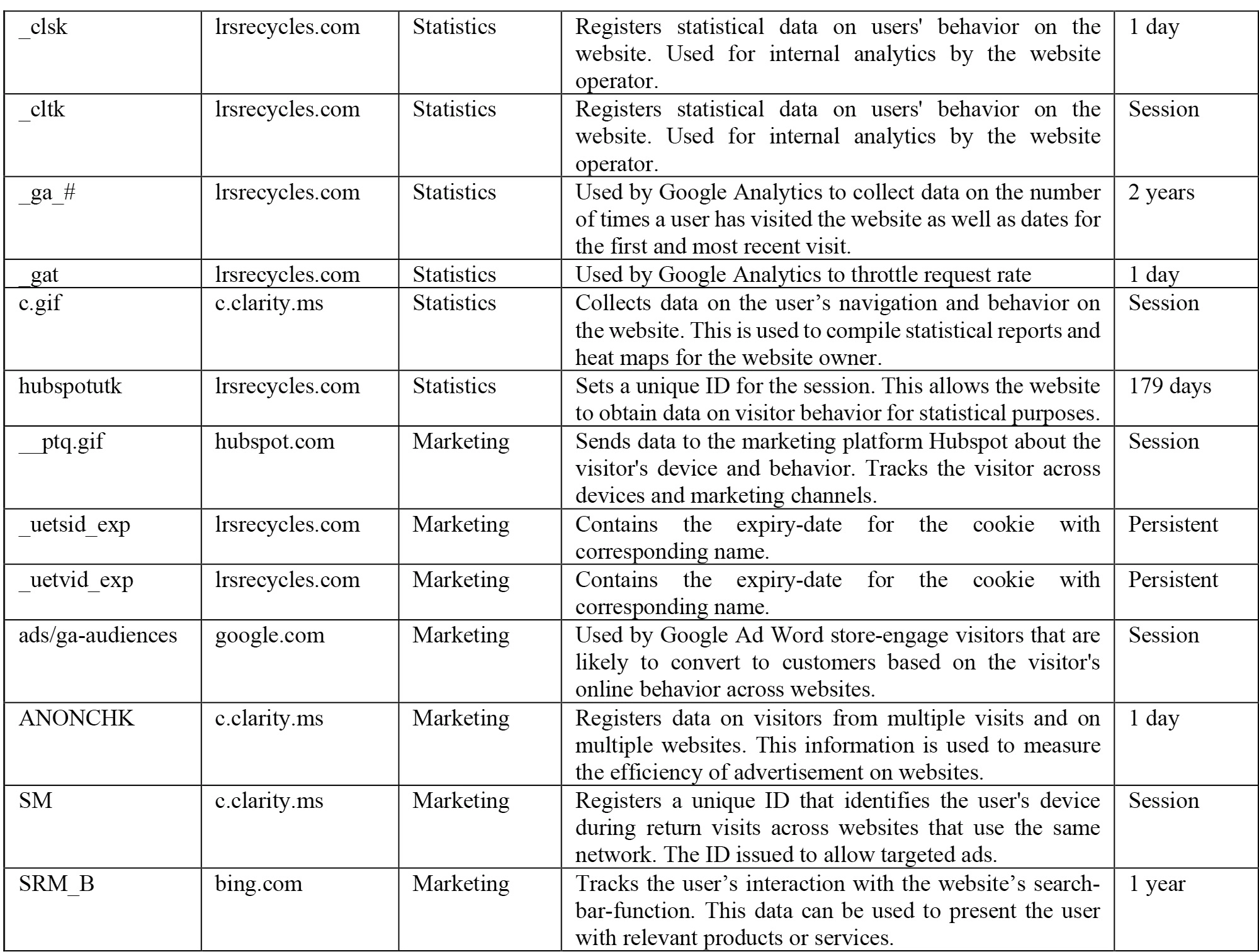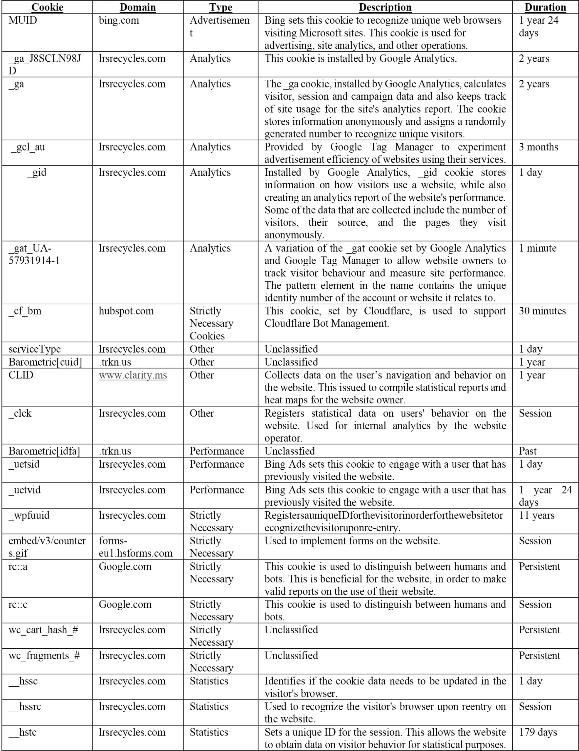The Lakeshore Recycling Systems Cookie Policy (“Cookie Policy”) applies to this website (“Site”) and LRS subsidiaries and/or affiliates (hereinafter “LRS”, “we”. “us”, “our”). This Policy sets out how we collect and process information about you on the Site through the use of cookies. We use the term “cookies” in this Policy to refer to website cookies and to similar technologies that may collect information automatically when you visit the LRS Site (such as pixel tags, web beacons, device IDs and similar technologies).