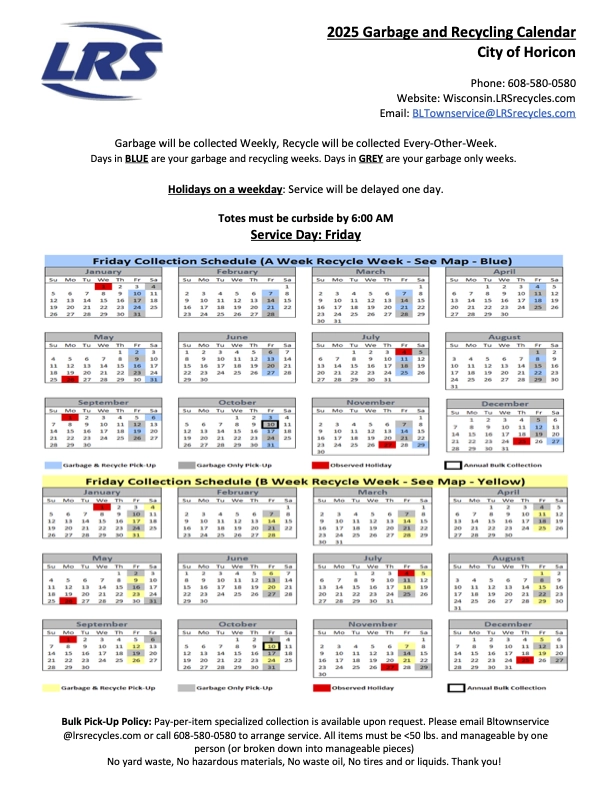 - Waste is collected weekly on Friday for all City of Horicon residents