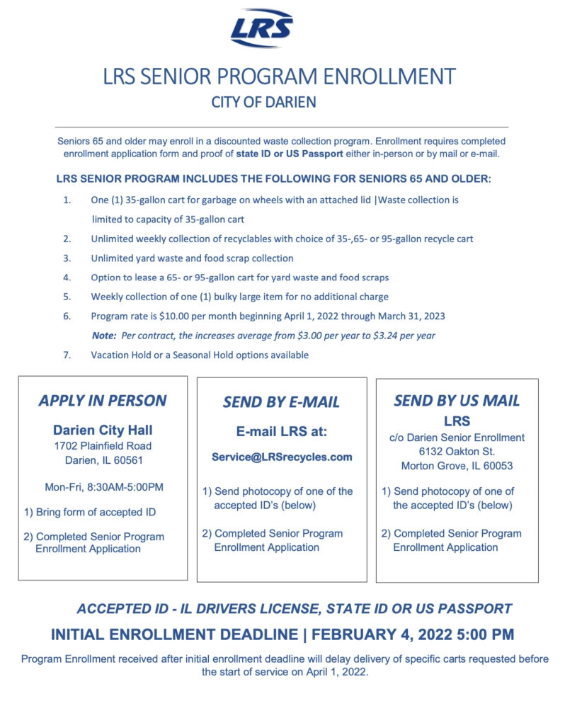 - Request Senior Program Enrollment Form by E-Mail at Service@LRSrecycles.com or by calling 844-633-3577