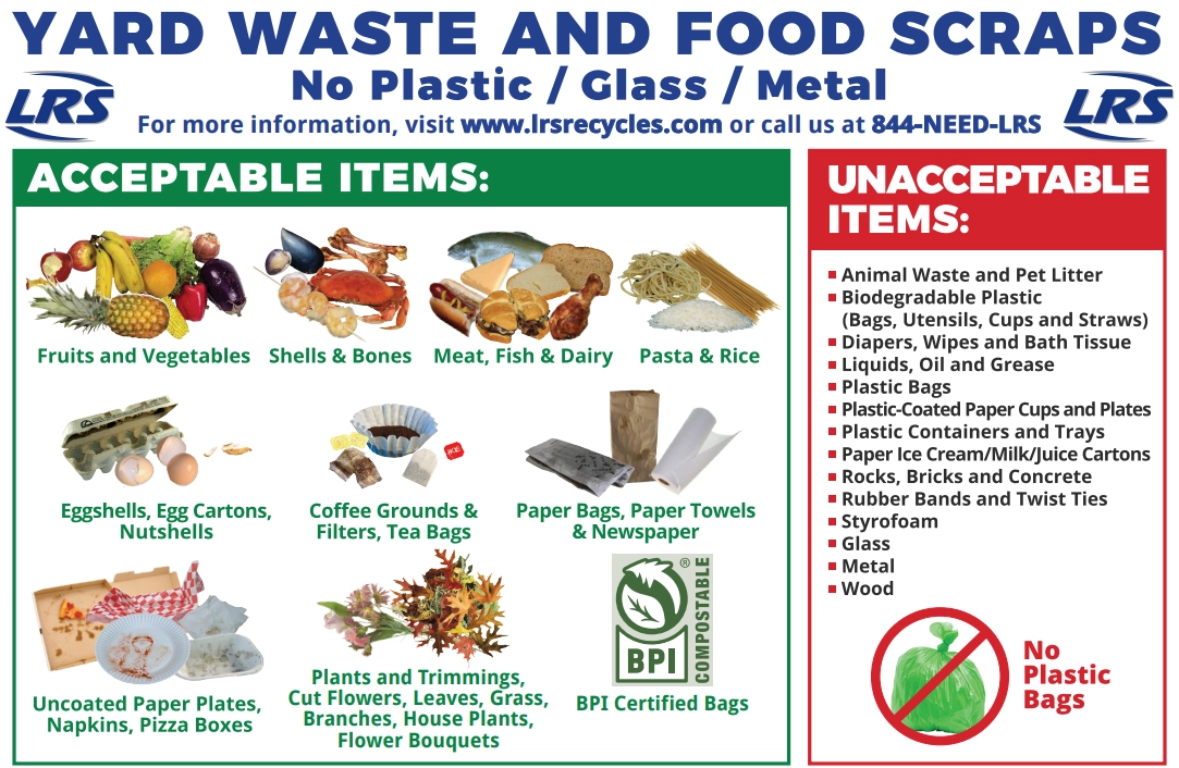 Yard waste, also known as landscape waste, consists of organic waste materials accumulated as the result of cultivation and maintenance of gardens, lawns, shrubbery, trees, and vines. Organic Food Scrap may be mixed in with yard waste April through November.