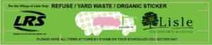 The Village of Lisle refuse, yard waste and organics sticker is green and is used for non-LRS personal containers for trash, bulk items, yard waste/organics, appliances, electronic and household hazardous waste. See each section to learn how many stickers are required for each item placed out.
